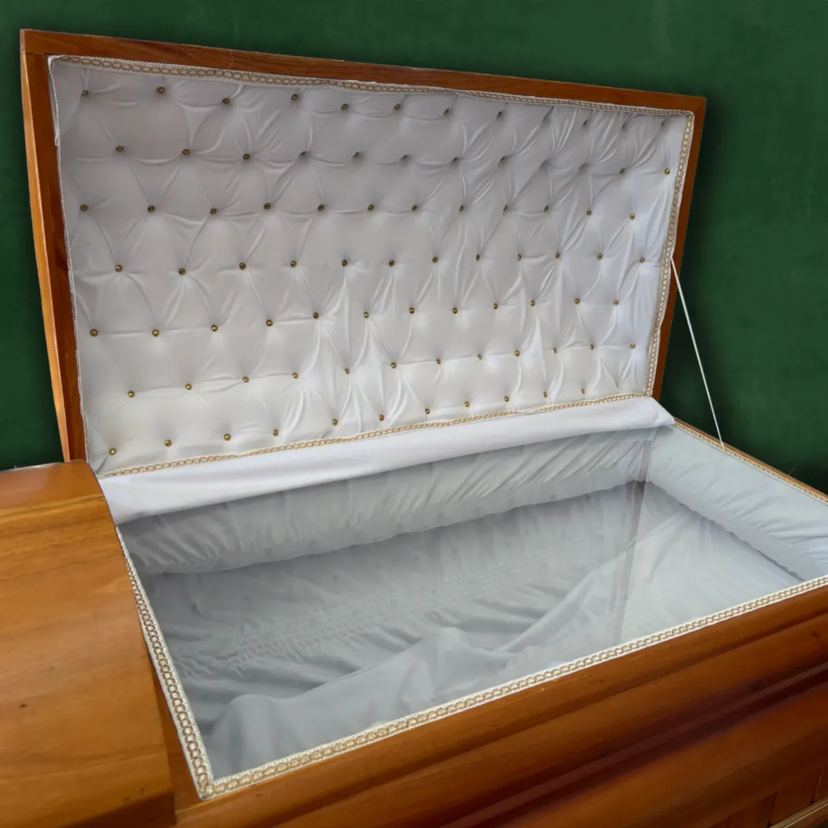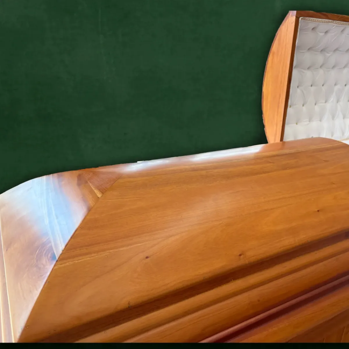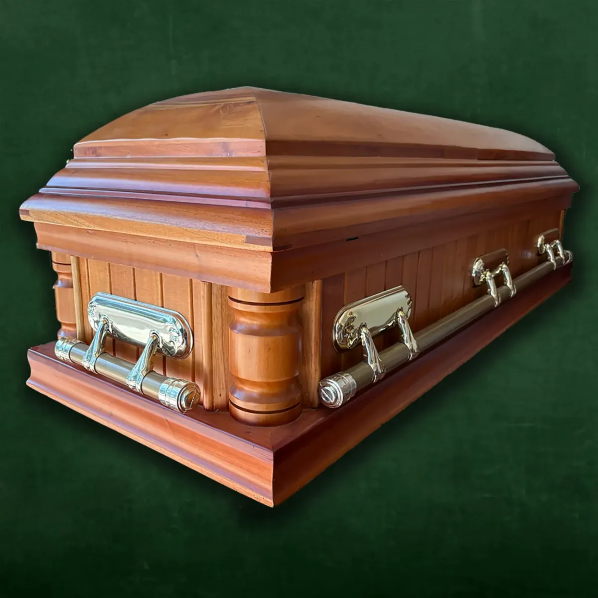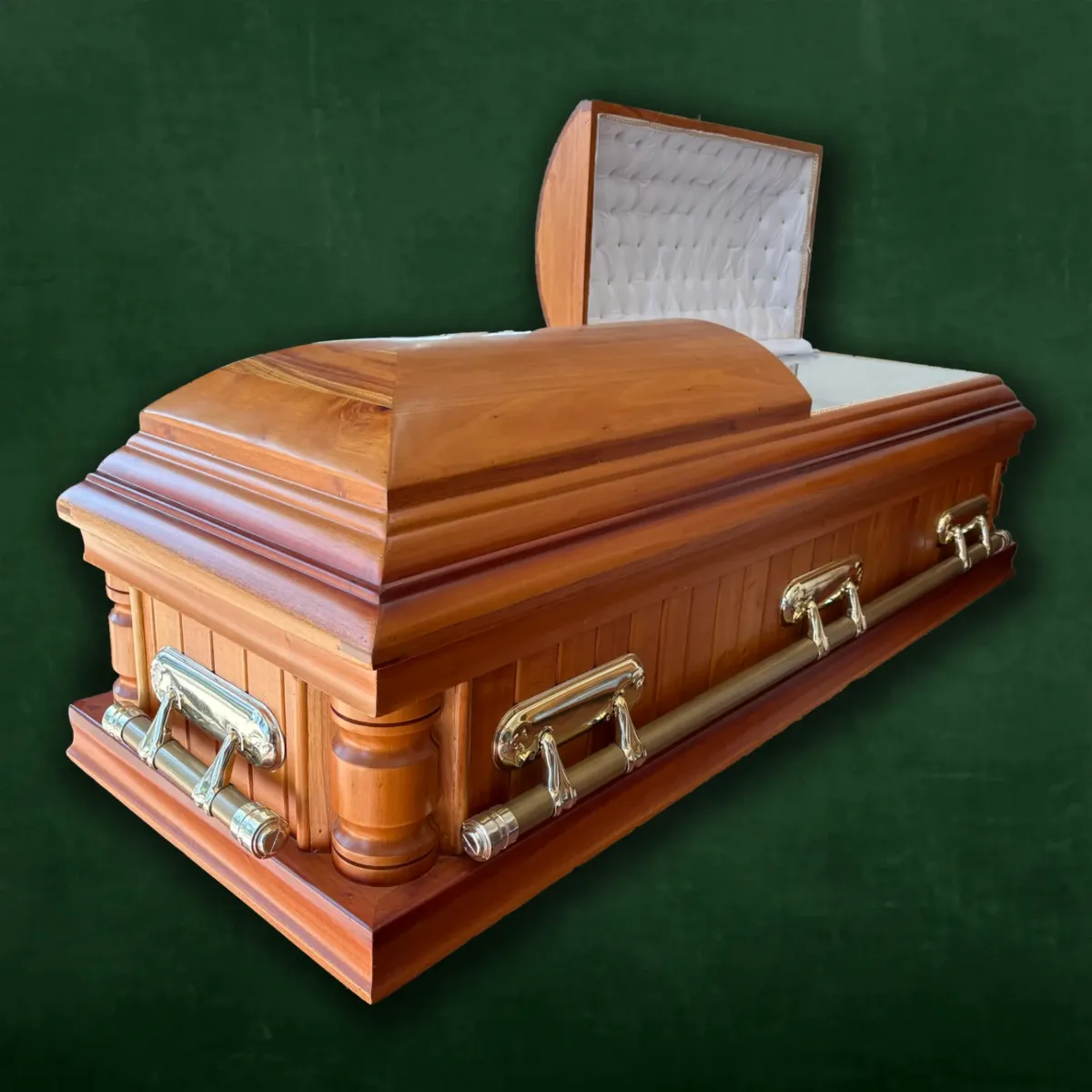 Elegante ataúd fabricado en madera de cedro de alta calidad, con acabados finos y herrajes dorados. Interior acolchado en terciopelo blanco para un descanso digno.