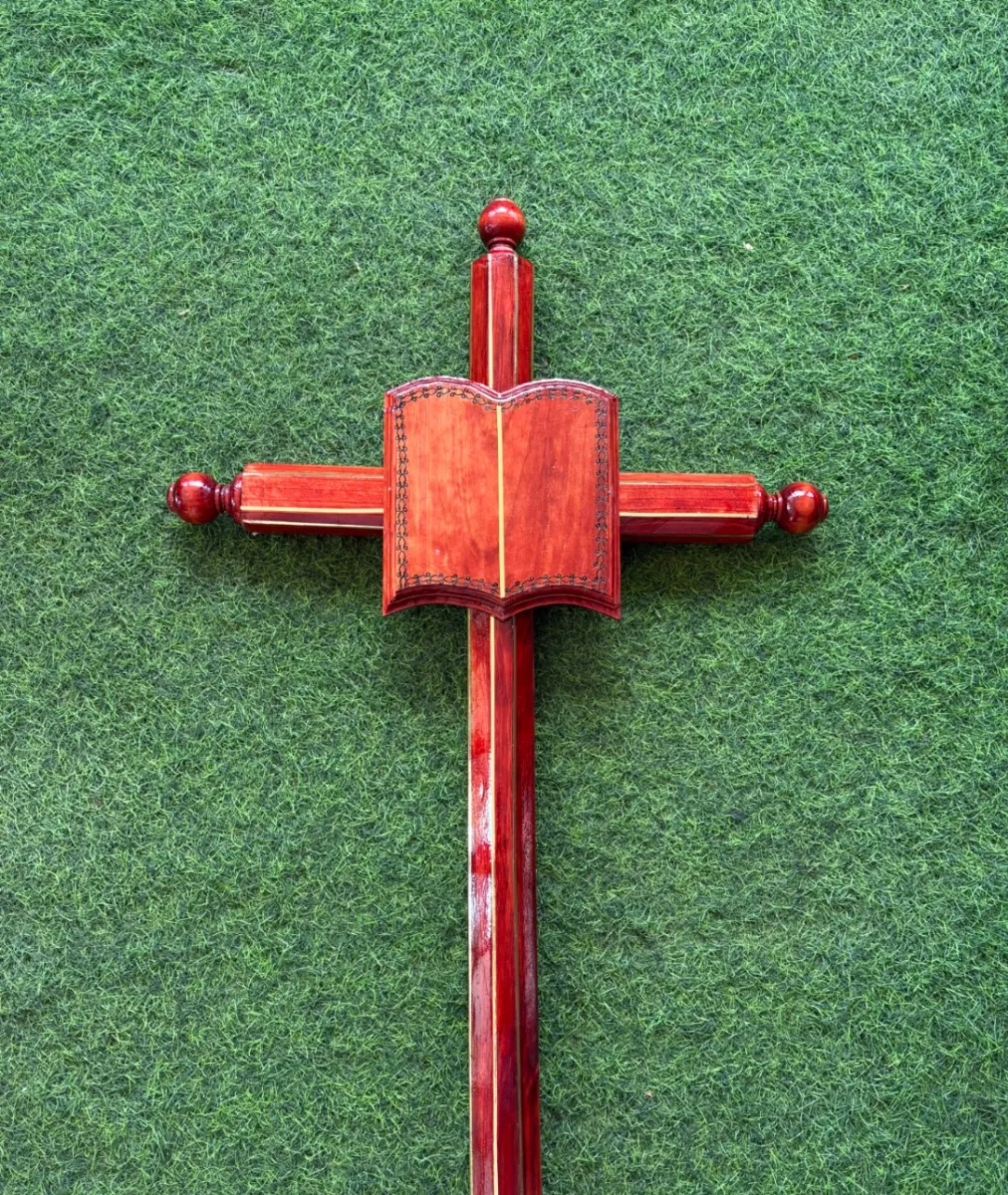 Cruz Ochavada de pino barnizada. Tono Caoba rojiza. Placa estilo Libro. Medidas: Alto de 1.33 metros y ancho de 0.63 metros. Incluye grabado de vinilo.